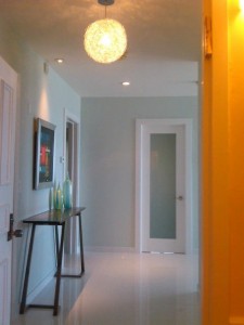 For foyers and hallways with enough floor-to-ceiling height try incorporating decorative pendant fixtures but be careful to check clearance from the bottom of the fixture (including height of ceiling canopy if applicable) so that even a tall person can comfortably pass by underneath. For lower ceilings, go with flush or semi-flush fixtures, and for the simplest scheme where space is available above the ceiling you can go with recessed lighting. However, you will need to check to be sure there are no HVAC ducts or plumbing pipes in the same spots and that the recessed housing will fit properly.