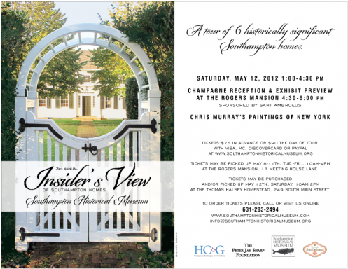 3rd Annual Insider’s View of Southampton Homes Saturday, May 12, 2012 1:00-4:30pm Home Tour 4:30-6:00pm Champagne Reception $75.00 in advance, $90.00 day of the tour Tickets may be picked up May 8–11, 10 a.m.–4 p.m. at the Rogers Mansion, 17 Meeting House Lane Tickets may be purchased and/or picked up May 12 10 a.m.–2 p.m. at the Thomas Halsey Homestead, 249 South Main StreetTo purchase tickets or for more information please call 631-283-2494 or email info@southamptonhistoricalmuseum.org, and visit southamptonhistoricalmuseum.org
