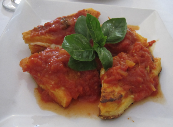 The first appetizer arrived at the table. It was a dish called Mozzarella in Carrozza, which is a slice of tomato sandwiched between two slices of bread, covered with succulent chunks of tomatoes and topped off with fresh basil. Pullara explained this dish is usually deep-fried, but he wanted the dish to be lighter, and that it was. It was pan fried with no oil. Next was the stuffed artichoke – stuffed with breadcrumbs, mushrooms and pignoli nuts. The pignolis added a nice crunch. The wine was paired perfectly with these appetizers – a great choice on Valente’s part.