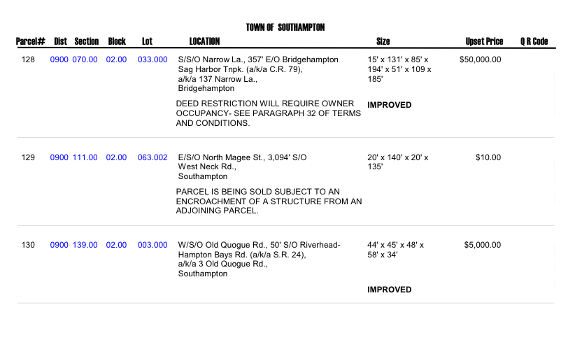 Properties in the Hamptons that are scheduled to be auctioned off include the list below. For more information and details visit http://www.suffolkcountyny.gov/