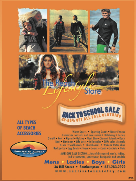 Sunrise to Sunset Surf & Sport in Southampton offers a great selection of fall clothing and sporting apparel including fashions by; Roxy, Quicksilver, Ripcurl, Billabong and Hurley to name a few. Sunrise to Sunset Surf & Sport is located at 36 Hill Street in Southampton, 631-283-2929 or visit www.sunrisetosunsetny. com. Open year-round.