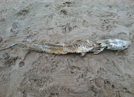 “We stumbled across the remains of a sea creature washed up in Amagansett, off Treasure Island Drive,” reader Marie Noble shares with us. “It may not be the Montauk Monster, but still…”