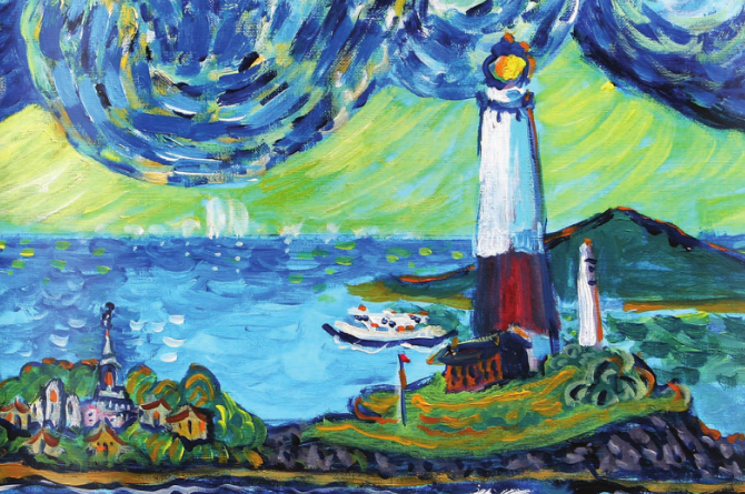 While you appear to enjoy variety in your life, your art series duplicating Van Gogh’s “Starry Night” is the same no matter what place you apply it to. For example, the cover has to do with Sag Harbor. In what other locations have you painted a “Starry Night?”