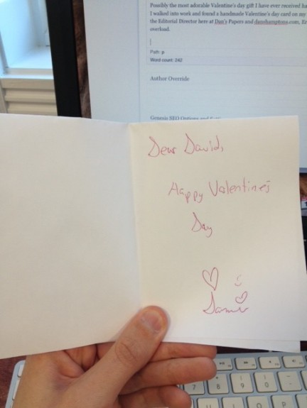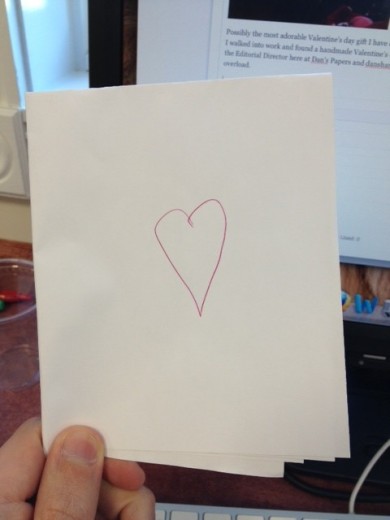 Possibly the most adorable Valentine’s Day gift I have ever received came to me this morning when I walked into work and found a handmade Valentine’s Day card on my desk from the daughter of the Editorial Director here at Dan’s Papers and danshamptons.com.