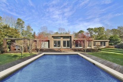 This modern contemporary with 4 bedrooms and 3.5 baths is located on a quiet street south of the highway in Wainscott. The spacious, well laid out floor plan makes this home comfortable and airy while providing privacy for you and your guests. The kitchen, formal living room and separate sitting area all overlook the lush established landscaping. The master bedroom suite, which encompasses the whole second floor, offers an additional private den or office. The expansive cleared property coupled with the private pool and hot tub area is portioned off providing a secluded area for relaxing and sunbathing. Stroll to the prestigious Beach Lane or enjoy the convenience of being close to Wainscott‘s farmstand, shopping and transportation.