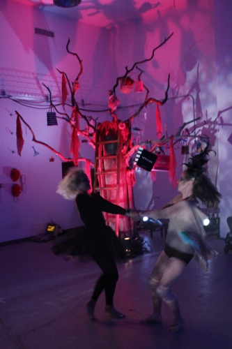 I heard music coming from a small, darkened room and I looked inside. Eve and Man were playing house…but was it a game, or something much more serious? As Eve and Man played out their fantasy of the perfect American couple, the scene started to warp. Man became overwhelmed and ran out; the Maker stormed in and tried to reason with Eve, who was angry and stormed off. I heard a noise coming from the area with the tree, so I ran back.
