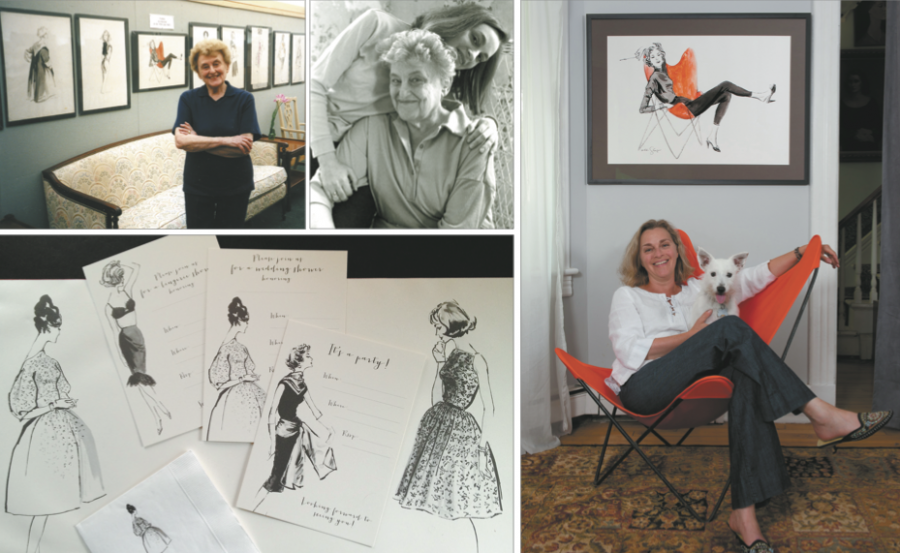 While Hilda did not grow up or draw on the East End, her illustrations can be found here. Her images graced countless covers of Vogue, Mademoiselle and Glamour, so anyone who picked up a magazine or dropped by a Saks or Macy’s in the last seven decades will have seen her creations. And now, thanks to her daughter Liz Glasgow (shown seated at far right), we can enjoy her sketches in stationery, gift wrap and wallpaper. Three years ago, Liz, a Greenport-based architectural photographer, began cataloguing her mother’s creations, re-creating them on notecards she hoped others would appreciate. Three years, a stationery show, an award and a partnership later, Liz’s business The White Cabinet is flourishing, and her mother’s drawings line shelves and charm shoppers in 550 stores nationwide.