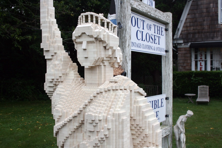 The nearly 6-foot-tall Statue of Liberty made from plastic LEGO construction blocks is still standing tall and waving to passersby in front of local vintage store Out of the Closet at the eastern end of Water Mill’s commercial center. It turns out the store’s owners Ruth Chernaik and Lucille Martin picked up this LEGO treasure at an estate sale, but they know little else about her.