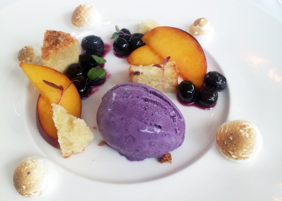 A bowlful of summertime arrives in the guise of a salad comprising Maple Brook Farms Burratta, La Quercia prosciutto, Wild Rocket and charred Long Island peaches; the cheese airy yet creamy, the ham a perfectly cured counter, the fruit a sweet aside. Crab Cake Eggs Benedict is an addictive nod toward Delmonico’s Eggs Benedict 1860s origins, offers a meaty crab cake with quail egg and a light, chili-dashed take on Hollandaise, plus a sliver of pork belly that makes you feel as if you’re in on the real porcine secret while bacon gets all the hype. The Aquerello Risotto comes with a tableside legend about how every grain of the fabled rice is hand-polished. Such stories are the stuff of foodie fantasies, but so is this night’s eloquent mix of shiitake mushrooms, truffles, corn and micro basil grown in the restaurant’s Chefs Garden, mere steps from the table.
