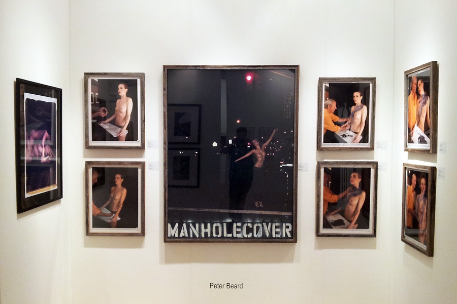 Though he’s best known for his iconic, often blood splattered photographs of Africa, elephants and beautiful models, Beard’s new work—recently displayed by New York City’s Westwood Gallery at Art Southampton—features a much more urban milieu. Most prominent among them was a larger photo of a topless model posed on a Manhattan street at night, the word “MANHOLECOVER” stenciled boldly in white spray paint across the bottom.