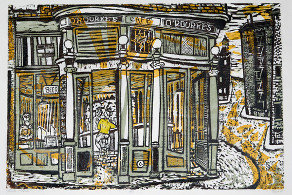 Davies has a particular feel for splintery wooden floors and shelves sagging under teetering boxes as in his print of a Chinese laundry. His evocation of a city gas station is pure urban poetry with two winged “A’s” framing a man in an Hawaiian shirt, seen lugging a heavy gallon gas canister to his most likely stalled vehicle, under the approving gaze of the gas station owner garbed in a stained and wrinkled T-shirt, baggy green work pants, feet encircled by a looping gas pump line. A cozy, inviting place to go is Davies’ O’Rourke’s bar, beautifully rendered in warm yellows, ochres and browns, in its swooping corner location, doors half-open glimpsing for the viewer its interior, welcoming you in.