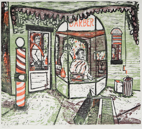 Davies’ wonderful feel for textures continues in the worn pinkish brick and sodden sidewalks of “Merritt’s Food” and the rags, polish, and cans of the ramshackle shop of the Shoe Shine man. Variations on the theme of a Central Park bench bring forth different moods. Seen from the back, the benches’ wooden slats create a rhythm of undulating lines and dictate the horizontal format of the print. On the print’s far right, balancing the horizontality, cluster a lamppost and the tall buildings that rim the park. One version of “Park Bench” is printed in dark red ink on white paper; with no people on the bench, the emptiness creates a lonesome feel. The second print bursts with color, calling forth spring or early summer. Davies has carved several more blocks adding masses of green trees, a man with a bright red brief case, a blue sky reflected in the blue reservoir, and the tall, white city buildings shining bright against the blueness. Most importantly, the benches are now crowded with people and conviviality. In this pre-cell phone era, people reach towards one another in conversation, interact, enjoy each other, their bodies not hunched over, eyes locked into tiny screens.