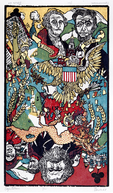 Ted Davies’ woodcuts “Cards of Life, Cards of Death,” also on view, represent 1960s society in America and worldwide at the time. Social and political criticism and satire are aimed at “Government,” “The Corporations” (Queen of Diamonds), “War,” more favorably “The Imagination,” “The Family” but finally, triumphantly, “Death.”