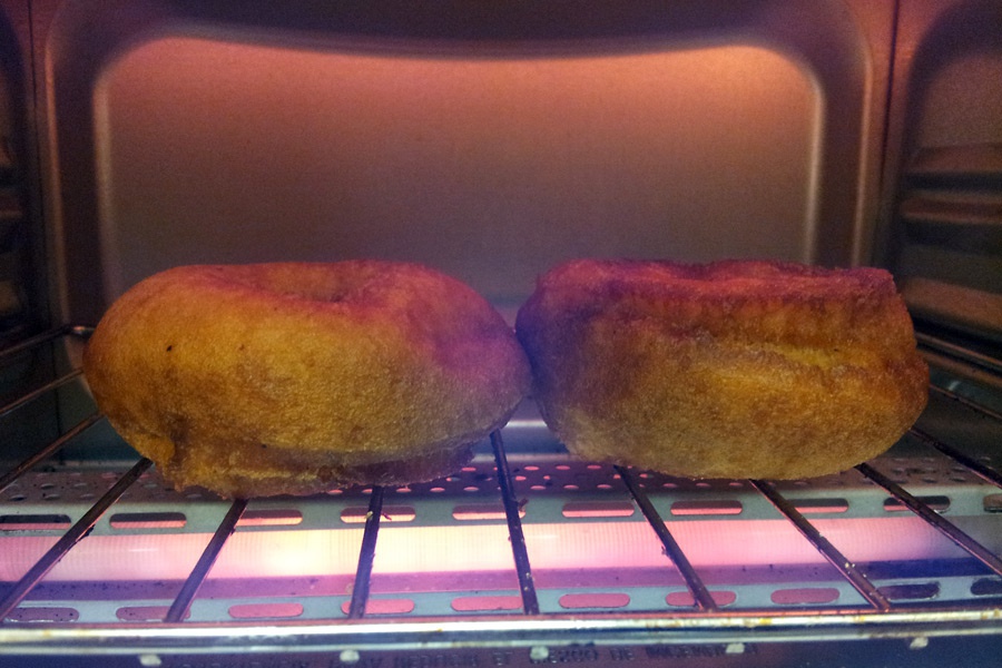 Now fire up your toaster oven to 300-400 degrees and toss in the doughnuts until they’re a little crispy on the outside and too hot to hold. While toasting, take your choice of vanilla ice cream (we use Häagen-Dazs here) out of the freezer and let it thaw a bit—maybe close to the oven to speed up the process, depending on how melted you like it.