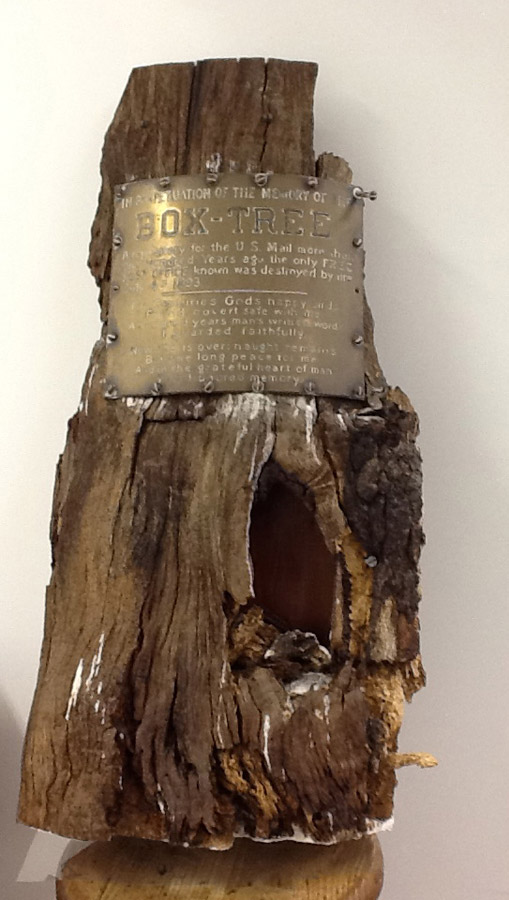 “IN PERPETUATION OF THE MEMORY OF THE BOX-TREE—A repository for the U.S. Mail more than 100 years ago, the only FREE POST OFFICE known was destroyed by fire July 4, 1893.
