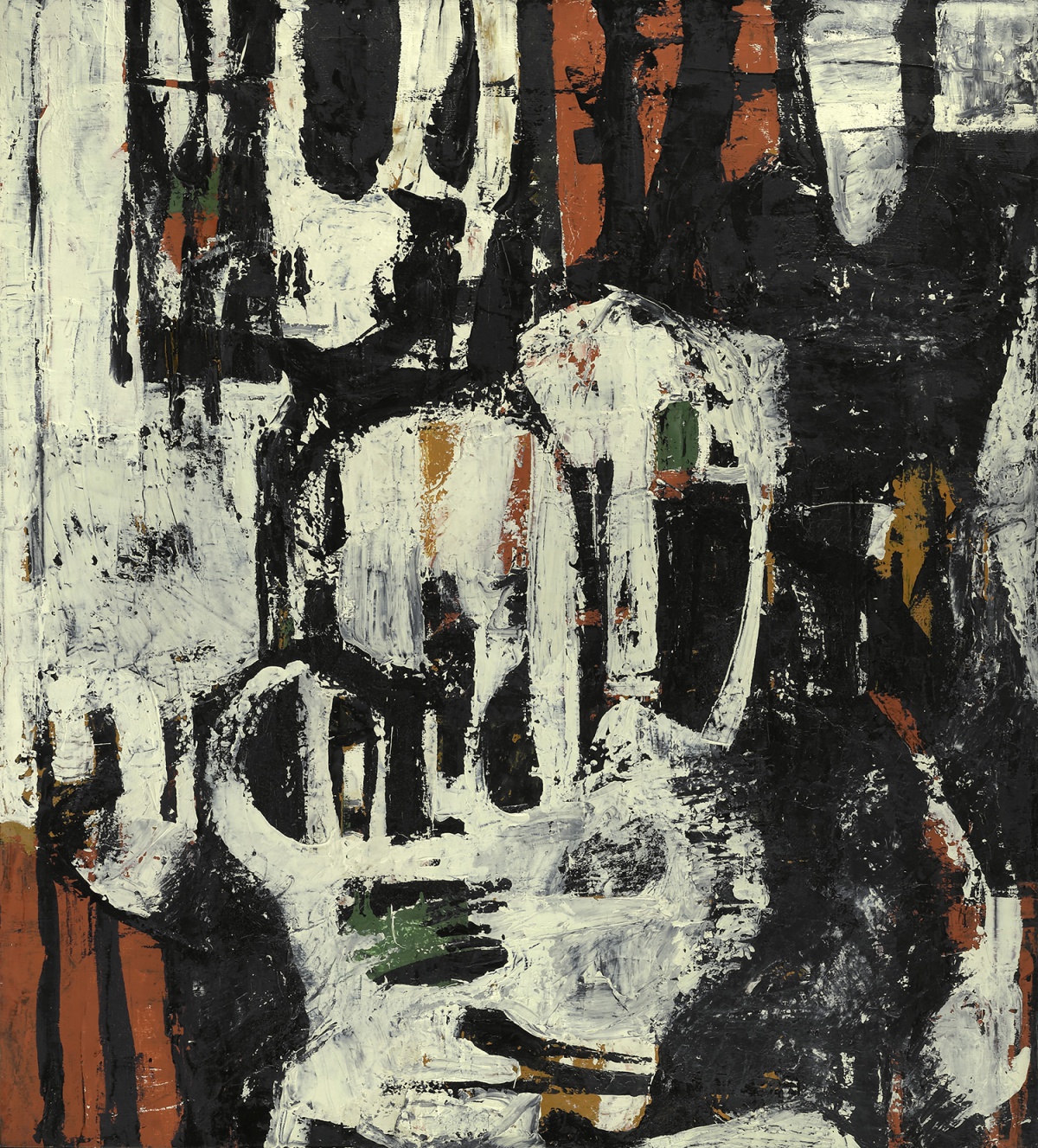 Biomorphic images take diverse forms in Park’s work that are on display. For example, “Number 25” (1951) seems to be a human face indicated in the middle of the black and white painting, yet it possibly has an animal’s body. A human face-like image appears again in “Lament” (1950), an oil on canvas. Dense figures dominate “Parade,” a small work defined by its orange and red colors. Is that a person or an animal that stands out in “Untitled,” a gouache on paper? These biomorphic images may be a product of imagination, but they appear to recur, nonetheless, representing Park’s signature aspects of bold forms, rhythm and juxtaposition of shapes.