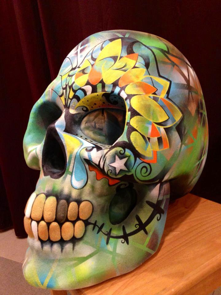 The highest level of interest was shown for the Bigg Head Skull decorated by PJ Linden who created a fantastical colorful dotted look using pink, green and blue puff paint over a black background to create an alien creature effect very similar to the patterns on Stingray leather. Other artists included Marco Art, Rascal, Kevin Charles Newcomb, Howie Keck, Ocean Clark, Jack Laroux, Miho Opal, Oliver Ray, PJ Linden, Sebastian Deregibus, Seong Eun Hong, Ben Copperwheat, Gabriel Shuldiner, David Waksman, Hannah and Evan Waksman, Michael Albert, Elise Dunn, Dezi Ray, Cadman Mendoza, Ryan Kittleson, DJ Roxy Cottontail and Goldenstein, who made a large 3-D colorful mosaic of a Sugar Skull from the Latin celebration Dia de los Muertos.