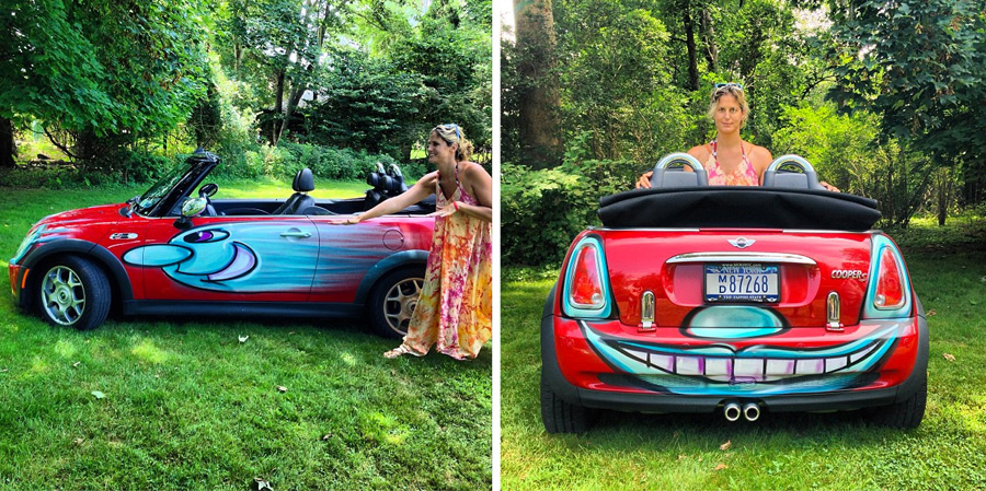 Scharf’s Instagram account, kennyscharf, is peppered with “Car Bomb” photo, including several in the Hamptons. The red Mini convertible is featured, freshly painted with a light blue character, in two shots dated July 30. The owner, “Lea from the hamptons,” poses with her car and the art, which Scharf calls “Tatoos for your car!” in both photographs.