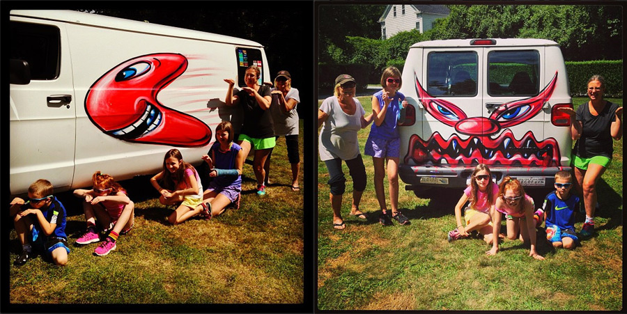 Scharf’s Instagram photos of the white van, with a large, red half-moon shaped character painted on the side, and a face painted on the back, is dated August 6. One caption identifies the owner (who posed with her children) as “Elizabeth from e. Hampton and her cute clan,” while the other reads only, “No tailgating.”