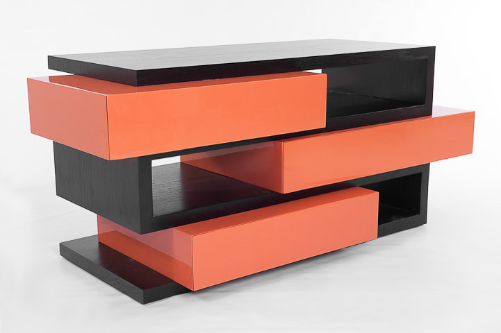 With his TIG welder in hand, Eicke began the next phase of his ever-evolving furniture designs. He started with materials and forms that he could fabricate himself. This led him to a sensibility of expression, that, even now, when working with others with much broader fabricating capabilities, his early geometric and minimal sensibilities can still be seen. His early work most often employed solid teak, stainless steel and high gloss lacquer. Didactic in manner, each component is individuated and identifiable, as expressed in one of his dressers composed of lacquered drawers, read as blocks, sliding within a solid teak-supporting frame.