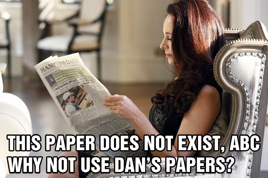 HAMPTONS AUTHENTICITY ALERT: Here, we see Victoria reading the Hamptons Daily newspaper (scroll down for picture). Neither this, nor any daily Hamptons paper, exist. Why wouldn’t they use a copy of Dan’s Papers here? Get with it, ABC. How I Met Your Mother and Royal Pains both reference the region’s most iconic weekly…