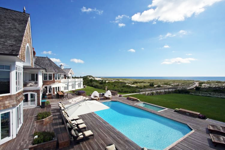 For sheer magnificence this estate, perched on nine acres between the Atlantic Ocean and Shinnecock Bay, is unrivaled. With spectacular water views, its evocative shingle-style architecture and 17,000-square-foot interior, it is in the great tradition of Southampton’s most splendid “Summer Colony” mansions. First built in 1988 and twice renovated since then, it includes a great room, three sitting rooms, dining room, eat-in kitchen, a master suite, eight guest rooms, two staff rooms and an attached guest cottage. Specialty spaces include a billiard room, home theater, game room, art room, yoga studio and gymnasium. The house is furnished with an eclectic collection of mid-century and contemporary Italian, Scandinavian and American furniture and art, and the rooms boast several dazzling pieces, including a monumental Barovier & Toso chandelier, a sideboard and coffee table by sculptor Michael Coffey, and a large bronze table designed specifically for the dining room. The grounds feature a tennis court, playground, pool with spa and a sprawling sun deck suitable for grand entertaining.