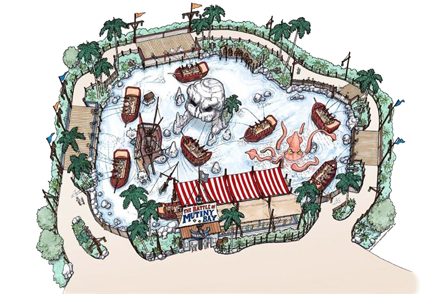 Splish Splash has been sharing photographs of their plans, branding, construction process, and progress, for The Battle of Mutiny Bay since March and it seems like it will be a hit. According to the original design drawings, the ride will feature eight pirate-style tall ships and some exciting sculpted features to set the mood—a kraken-like sea monster, wrecked ships, partially submerged rocks and a stone cave resembling a skull among them. An ample walkway surrounds the “bay” with four boardwalk “docks” where water cannons can be fired at the passing ships.