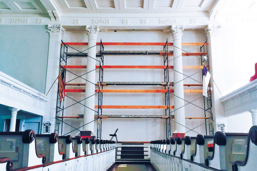 Step into Old Whalers’ Church on Union Street in Sag Harbor when you get the chance and you’ll get to see history remade. The giant trompe l’oeil mural at the south end of the sanctuary has been restored to its original glory. Colors, details and perspectives have all been returned to how they originally appeared when the building was completed in 1844, aspects that have not been seen in their full splendor since the 1890s.