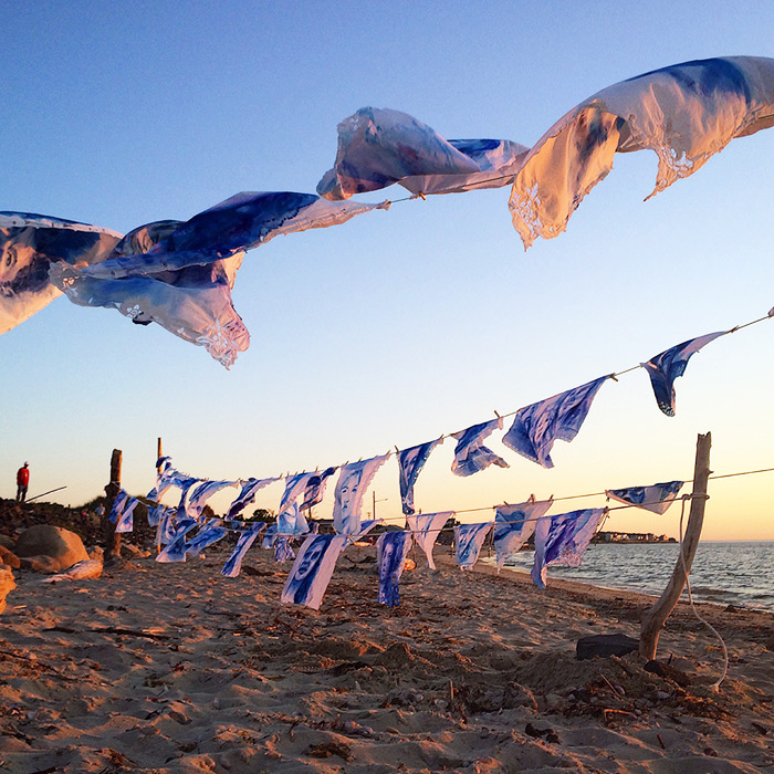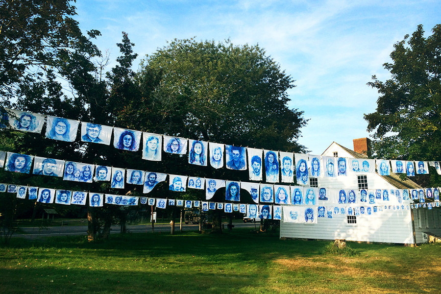 New York artist Aubrey Roemer set up shop in Montauk this spring with a goal to paint likenesses of 10 percent of the local population. Since April, Roemer has captured hundreds of subjects from the community on linens and cloths from various sources in Montauk, including gifts from many of the people she’s painted in varying hues of blue over the last five months. The culmination of that work, which Roemer has displayed in stages throughout the summer, will be presented in a large-scale installation titled “By Land & By Sea” at Eddie Ecker Park (Navy Road) on Montauk’s Fort Pond Bay this Saturday, September 6 from 3 p.m.– sunset.