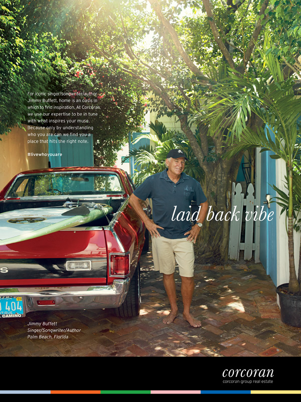 Past “Live Who You Are” ads—shot by noted photographers Tina Barney (Series 1) and Stefan Anderson (Series 2, 3)—used black and white photographs of people in their homes, coupled with commonly known real estate catchphrases. The Leibovitz campaign is in full color and doubles down on the talent with portrait photography’s top dog and 12 well known subjects, including rocker Jimmy Buffett, basketball star Tyson Chandler and pro surfer Quincy Davis among them, in their homes throughout Manhattan, Brooklyn, the Hamptons and Palm Beach (the markets Corcoran serves).