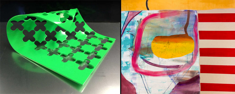 Open for just one more weekend, Poetics of Space featuring Jonathan Beer and Michael Chiarello is a two-man show highlighting the interplay between the paintings and sculpture by two excellent artists. Chiarello, of East Hampton, fabricates metal into beautiful sculpture, highlighting negative space and the object, while New York painter Jonathan Beer uses layering and various application techniques to play with both depth and color.