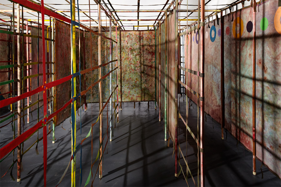 “Maze,” 1981-1982, is a life-size, interactive labyrinth that invites viewers to walk within. Sheets of multi-colored canvas, strung together with cotton belting, and suspended to aluminum poles, sway gently—giving life and softness to the work. The title of the exhibition, “In Motion” defines Shields’ work brilliantly—as this and other works, like “Dance Bag,” 1985, suspended from the ceiling, slowly spin and shift— revealing the artist’s interest in architecture, theater and dance. There is something playful and circus-like to the work, as if the artist lived in a fantastic world of his own creation. An original dance performance choreographed by Stephen Petronio specifically for “Maze” will be presented at the Parrish on November 7 and 8.