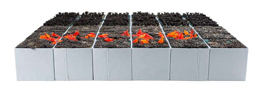 Beads, cloth and performance continue with the Bushwick-based Ladd brothers. Hand-sewn boxes, filled with intricate scrolls of fabric and adorned with beads of various sizes, become wall-sculptures and towers that represent both memory and performance. Memories for the collaborative fraternal team are shared ones—as illustrated in “Faith,” an incredibly detailed sculptural work made up of dark green scrolls, black-beaded trees, fire-colored hand-blown glass “flames” and handcrafted brass ants, represents a forest area where they were not allowed to play as children in their hometown of St. Louis. The performance aspect of “Faith,” which took place on October 26, began with the 36 boxes, closed and stacked in a tower, which the Ladds will systematically open and arrange into the forest landscape. Performance also comes into play, in the form of engagement, with their “Scrollathon” community project—something the Ladd’s have done with kids and women on Rikers Island as part of their mission to spread positivity through craft collaboration. Through making scrolls of tightly wound found materials, participants are introduced to sustainability and their own ability to create, as well as bonding through a discussion of values. A Scrollathon will be taking place at the Parrish as well—with an opportunity for kids from all over the East End to take part in the collaboration and then see their work on display at the museum in February, 2015.
