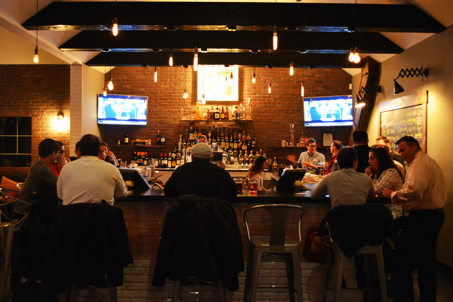 In both atmosphere and its menu, Brewology aims to be contemporary casual. Edison bulbs hang from exposed beams above the U-shaped brick-clad bar, where the taps are at the center. Rather than trying to read a crowd of tap handles, bar patrons and diners are given a menu with detailed descriptions of each beer, and they just give a number from 1 to 24 to place their pint order.