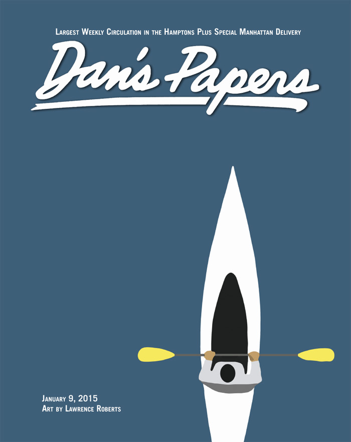 This week’s cover is unusual and distinctly that of artist Lawrence Roberts—whose work Dan’s Papers readers may recognize from past covers, including a tennis court, “Game of Shadows,” which coincided with the 2012 U.S. Open, and “A Touch of Romance,” which featured a picture of a dressed-up couple dancing on the beach. This week’s image is cool and sleek, like an Alex Katz—and without any trace of the artist’s hand. What forms an overhead view of a person in a kayak are simplified, individual shapes of pure, solid color. From his New York City abode, Roberts lets us in on his technique and background.