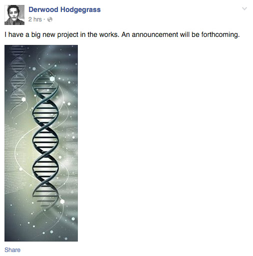 In the midst of his birthday celebration in Abu Dhabi, Southampton billionaire Derwood Hodgegrass sent out a cryptic teaser on Facebook at around 2 p.m. on Tuesday, March 17. The message, coupled with a picture of a sleek, grey DNA strand, noted, “I have a big new project in the works. An announcement will be forthcoming.” (see screenshot below)