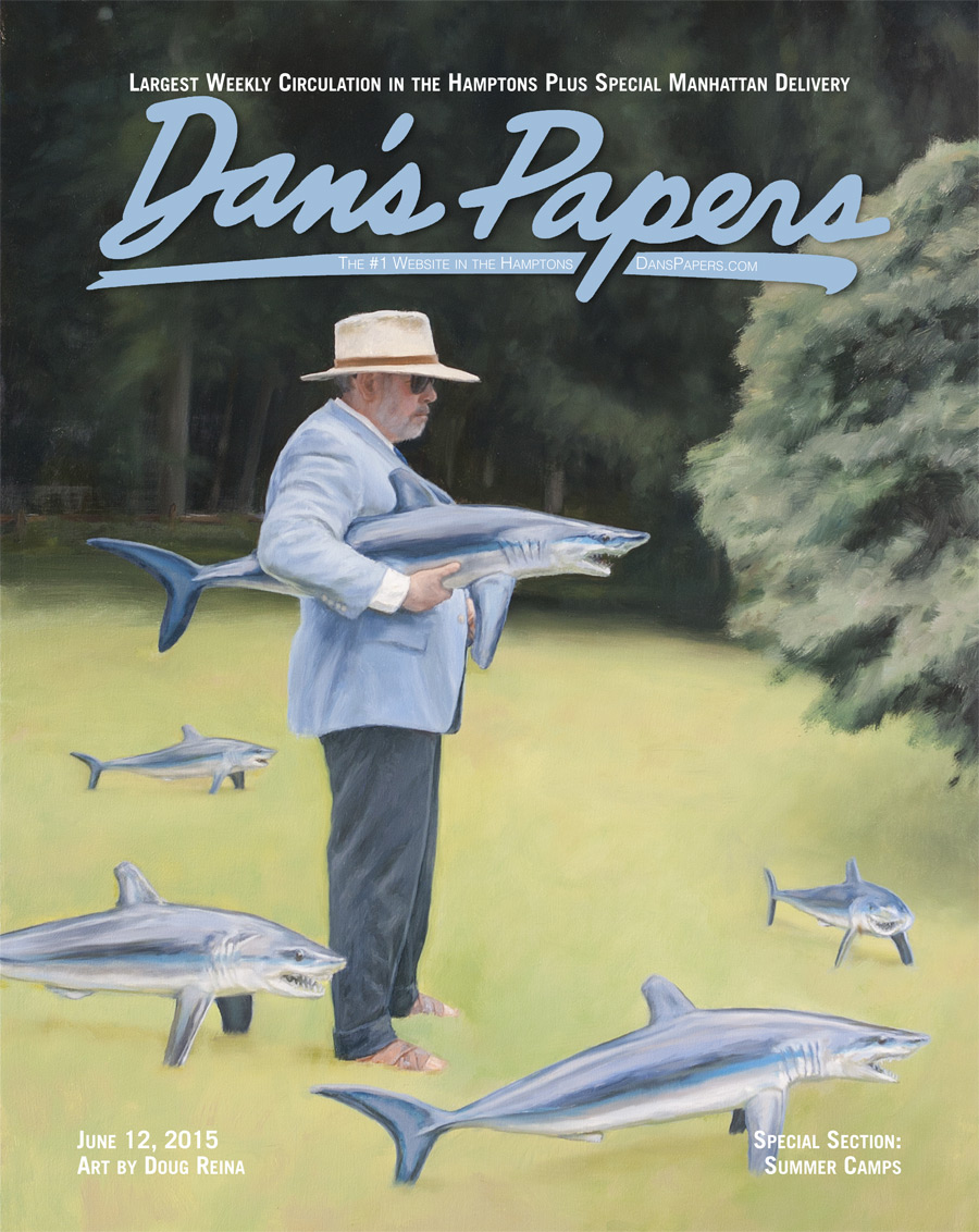 Forget that hat—the face, in profile, is not that of the eponymous president and editor-in-chief of this magazine, Dan Rattiner, but is rather that of the artist himself, Doug Reina, whose 60” x 37” surreal but realistically painted oil on canvas “Self Portrait With Sharks” may well start the kind of conversation Reina likes his works to elicit. He wants viewers to feel that they’re always looking at something new—which indeed they are in this week’s cover art. The brim of the man’s hat is fin-like, and his jacket matches the skin of the shark he’s holding like a weapon.