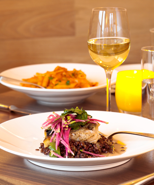 aMano Restaurant in Mattituck serves dinner daily beginning at 5 p.m. and lunch on Saturday and Sunday beginning at noon. Dinner items, subject to change, include: tomato, basil and mozzarella and smoked duck, roasted tomatoes, fontina and saba, wood-fired pizzas; charred octopus with seedless grapes, fingerling potatoes, capers, red onion and black olive vinaigrette; Bibb salad with smoked duck, pignoli, sundried cherries and white balsamic vinaigrette; housemade ricotta gnocchi, wild mushrooms, truffle oil and shaved Parmigianino; whole-roasted branzino with garlic-scented spinach, extra virgin olive oil and lemon jam; marinated pork chop with roasted peppers, balsamic-red wine glaze, duck-fat potatoes and apple-cinnamon compote; and stuffed veal chop with prosciutto, truffled pecorino, sage, pancetta-scallion potato mash and mushroom glaze. 631-298-4800 amanorestaurant.com.