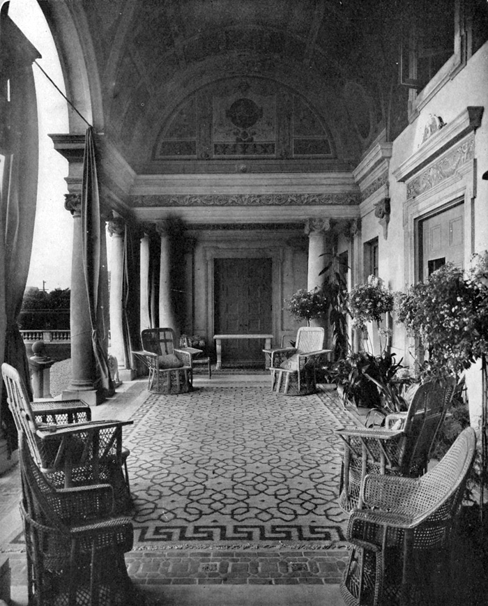 The entrance to this striking villa was through an arched porte-cochere in the south wing. The interiors were also a surprise, unlike any others in the Hamptons, with rich wood paneling, coffered ceilings, frescos, inlaid mosaic floors and equally impressive furnishings covered in velvets and brocades.