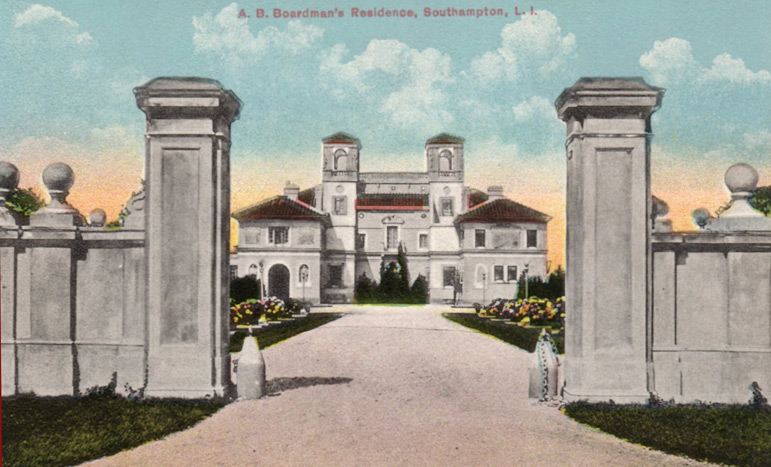 At the Southwest corner of Coopers Neck Lane and Great Plains Road what appears to be a large landscaped lot was once the site of Southampton’s most incredible mansion. A stone wall surrounds the property and it’s heavily overgrown with ivy, but at the center of the wall facing Coopers Neck Lane is an opening that looks down an empty drive. One would expect to see a beautiful home at the end of such an allée, and at one time there was.