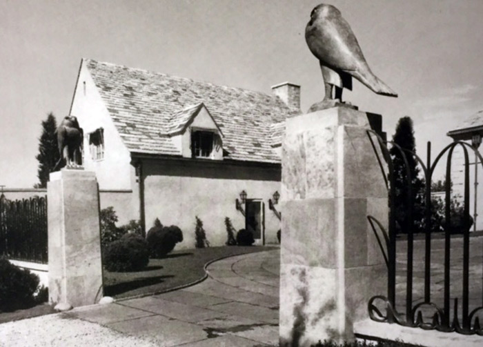 The building that would become Four Fountains bore no resemblance to the Tyngs’ home. The architectural firm of Peabody, Wilson & Brown, more noted for their traditional Colonial or Georgian Revival vernaculars, designed a modern, almost classical building in the Art Deco style. The building is approached from Halsey Neck Lane, through a short allee of trees, and ends in an entrance courtyard. The courtyard opening greets the visitor with two stone piers surmounted by Art Deco falcons and a surrounding fence with Art Deco detail.