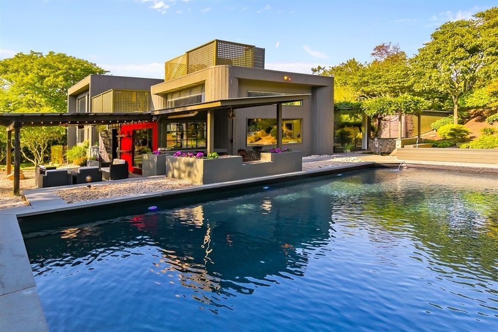 The was built with reclaimed wood throughout, and there’s a large kitchen and an outdoor kitchen, both perfect for entertaining. More interesting tidbits: the sink in the master bath is made out of Arizona turquoise. (Cool.) Bedposts in the guest rooms are made from pilings salvaged from the old Montauk Yacht Club. (Cool.) There are multiple koi ponds. Sunken stones are incorporated into the home, including bathrooms, and there’s a sauna equipped with infrared technology and a teak tub. Outdoors, the pool is near a lily pond; more stones are sunken into the earth to form a path that leads you from the waterside of the property to the top of the hill.