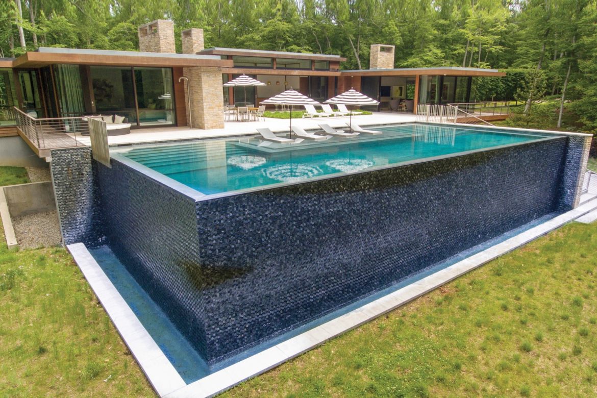 We guess so! The house is 5 bedrooms, 5 baths and 2 half baths in 6500 square feet, set on 2.06 of an acre. Designed by architect Kevin O’Sullivan, the house a new build that combines iconic midcentury modern style with the best of today’s technology, such as the glass wall that opens to the pool area. And the jaws of Mad Men-era folks would have dropped at the amazing 58′ infinity edge pool with 14′ waterfall. Outside also boasts the kind of amenities demanded today, like a stainless grilling station, a gas pizza oven, and an outdoor fireplace. Even the landscaping is midcentury in style.
