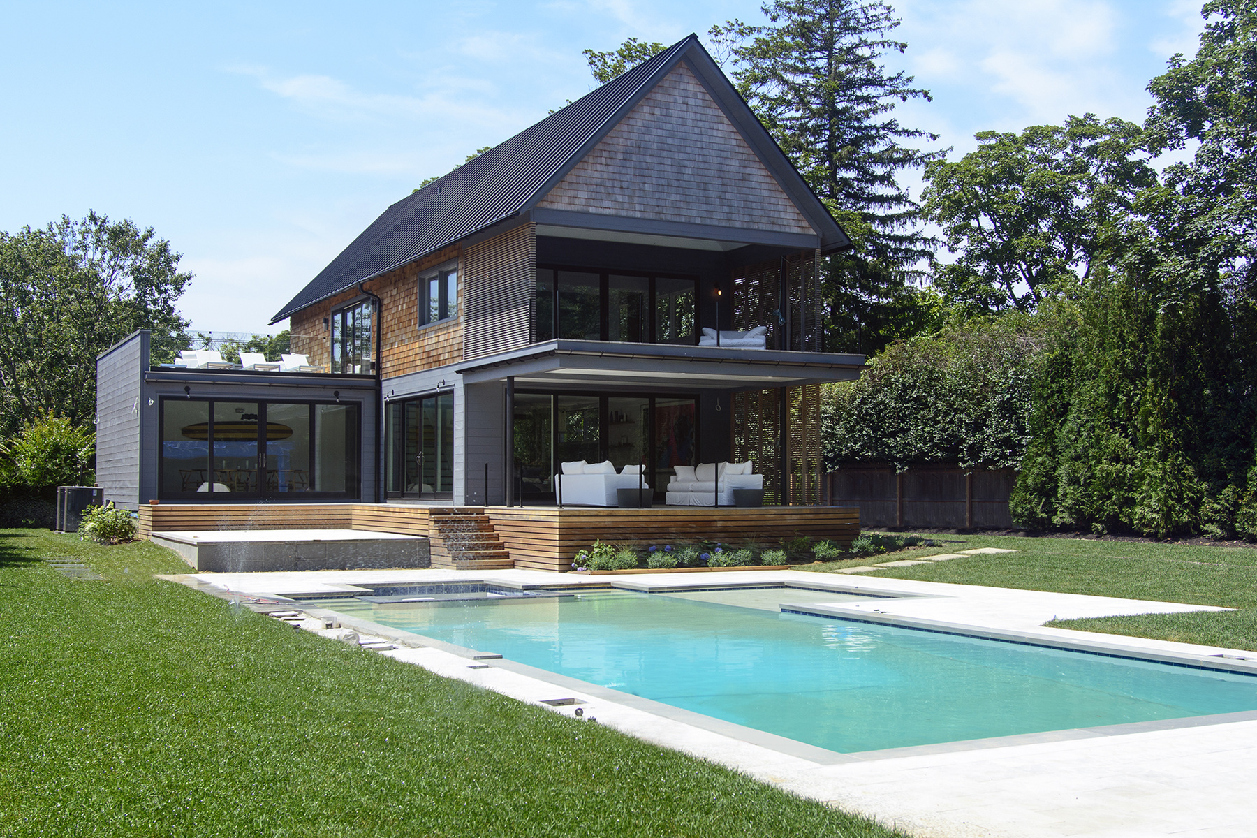 This is a very nice house–a standout architecturally. Today, it seems as though most new construction is either the “all white with black framed windows and a clear garage door” look or “wooden box with random small windows.” We’re not huge fans of either, frankly. But this place is different. It combines a traditional gable roof form with traditional shingles, along with huge windows and a box-shaped side.