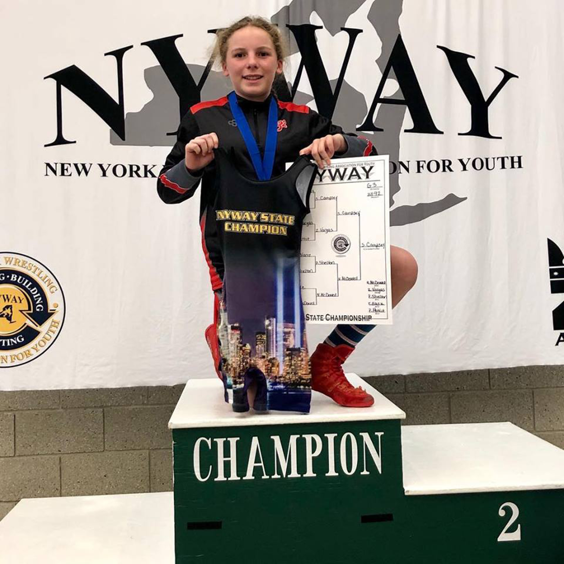 Sadie took first place in the March 10 NYWAY state wrestling tournament in Brockport after placing second last year. Competing in the G3 class for girls born between 2005-07, she swept both her 88-92-pound competitors with early pins.