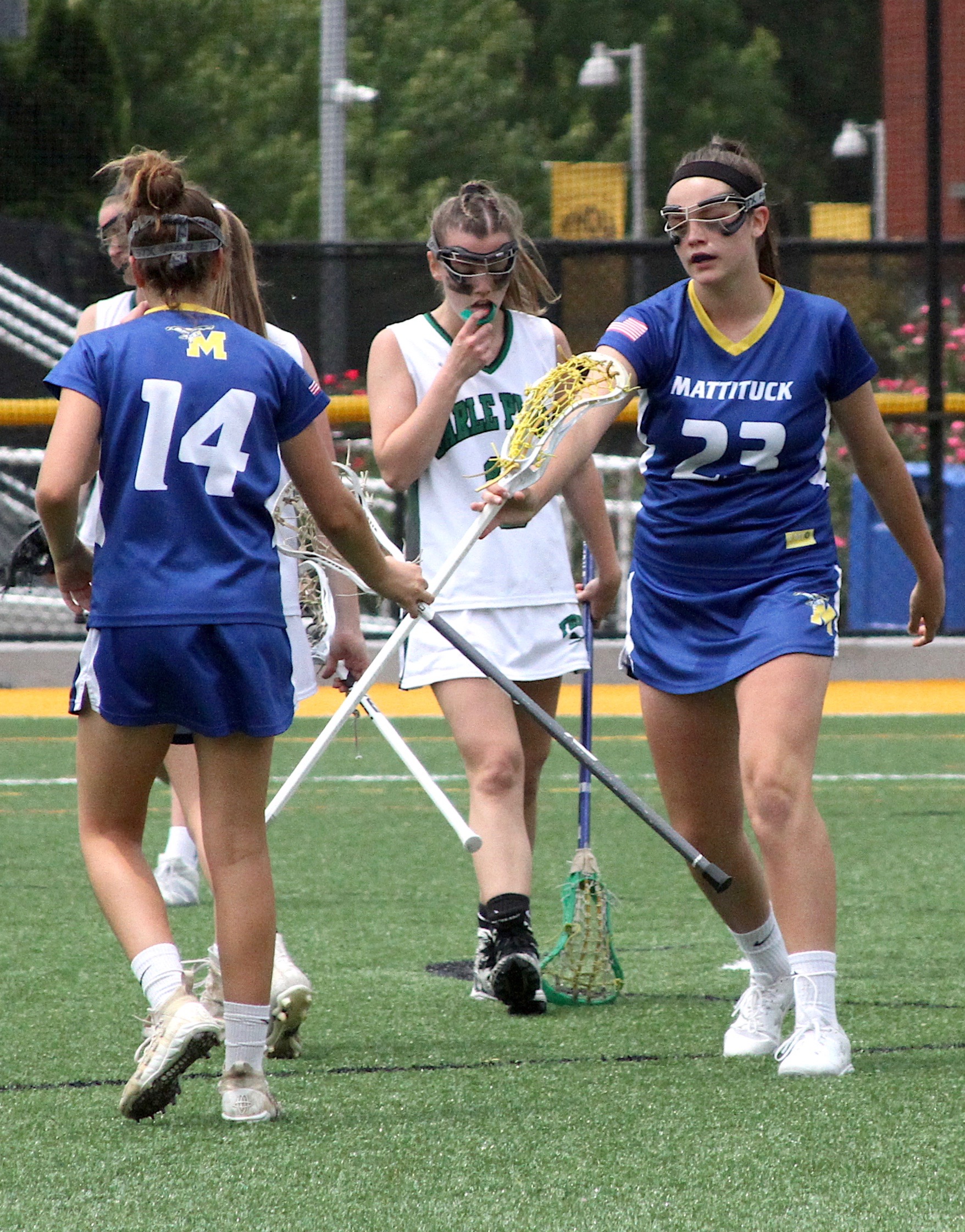 Hoeg set up Vasille-Cozzo’s first goal before she was fed the ball from her younger sister for a score that made it 4-1. After Carle Place cut the lead in half, senior Julie Siefert capped off a two-goal run that gave Mattituck (13-5) its largest lead of the afternoon, 6-2. Unmarked, she had an easy time rocketing the ball in from close range off a pass from Vasile-Cozzo on the wing with 8:55 left in the first half.
