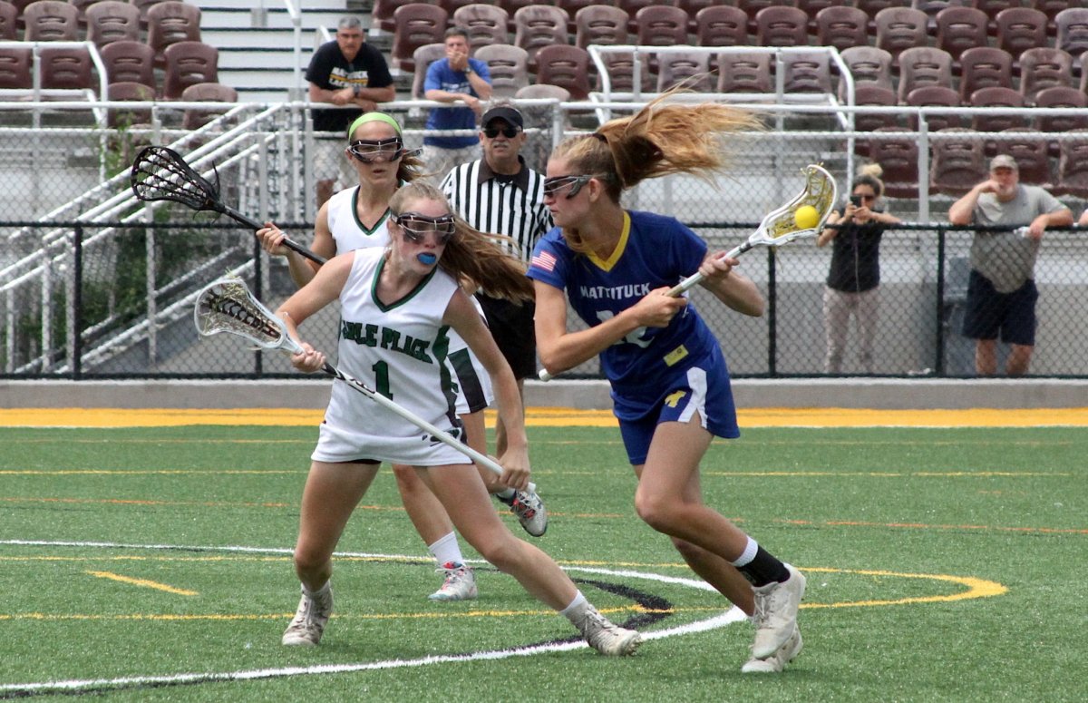 Riley Hoeg took her place at the center of Adelphi University’s draw circle June 1, and after the flick, came up with a scoop in a scuffle with less than three minutes left in the game to help her Mattituck/Southold girls lacrosse team win its third straight Class D Long Island championship title with a 9-8 win over Carle Place.