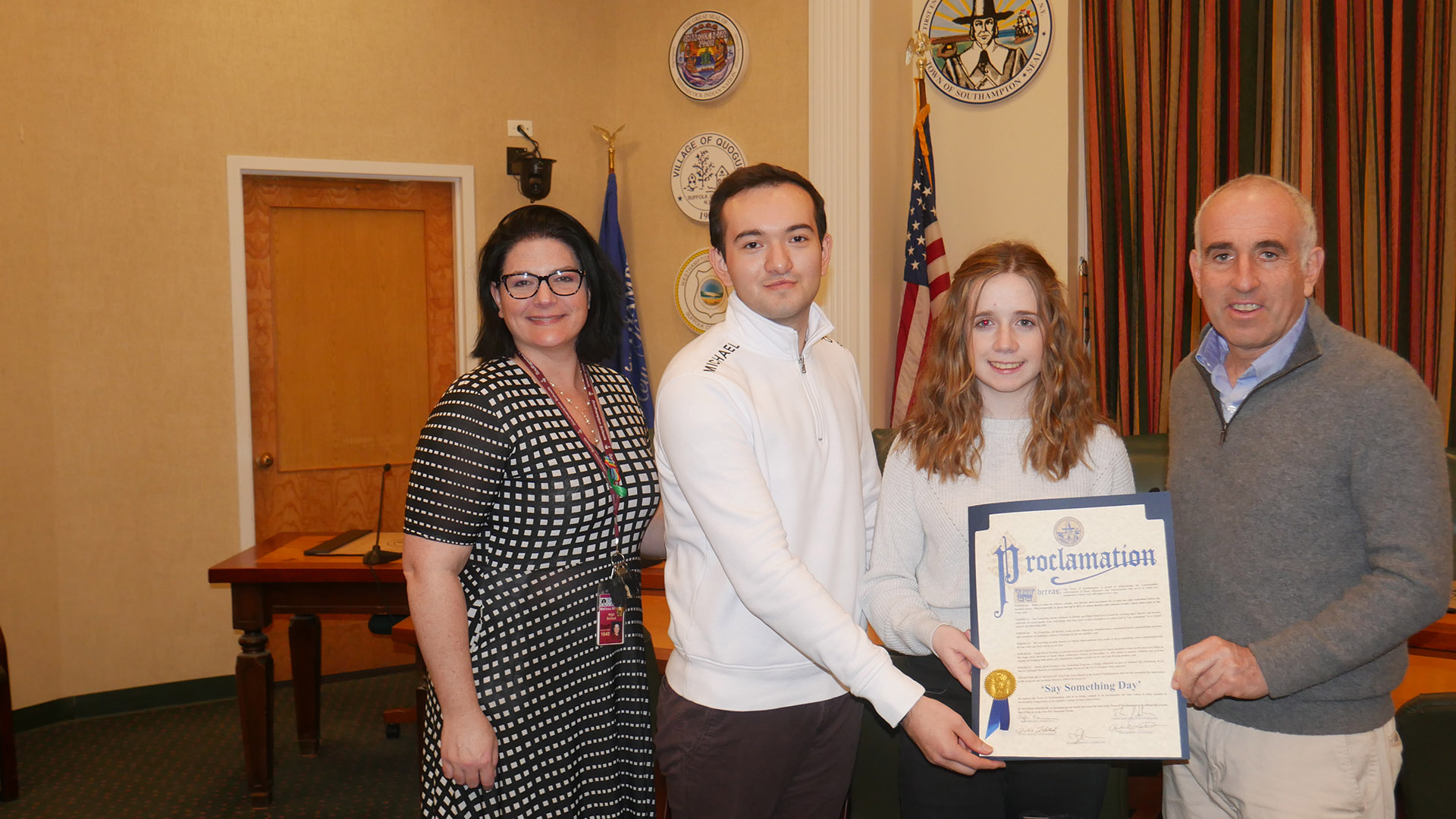 Southampton Town Supervisor Jay Schneiderman recognized the Southampton High School SAVE Promise Club during National Say Something Week. He proclaimed Friday, March 6, as “Say Something Day” in the Town of Southampton to encourage all students to speak up to prevent gun violence.