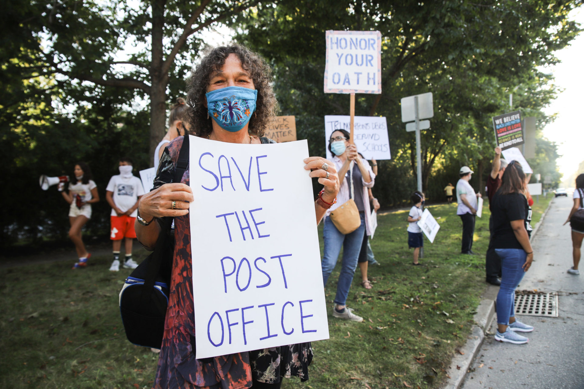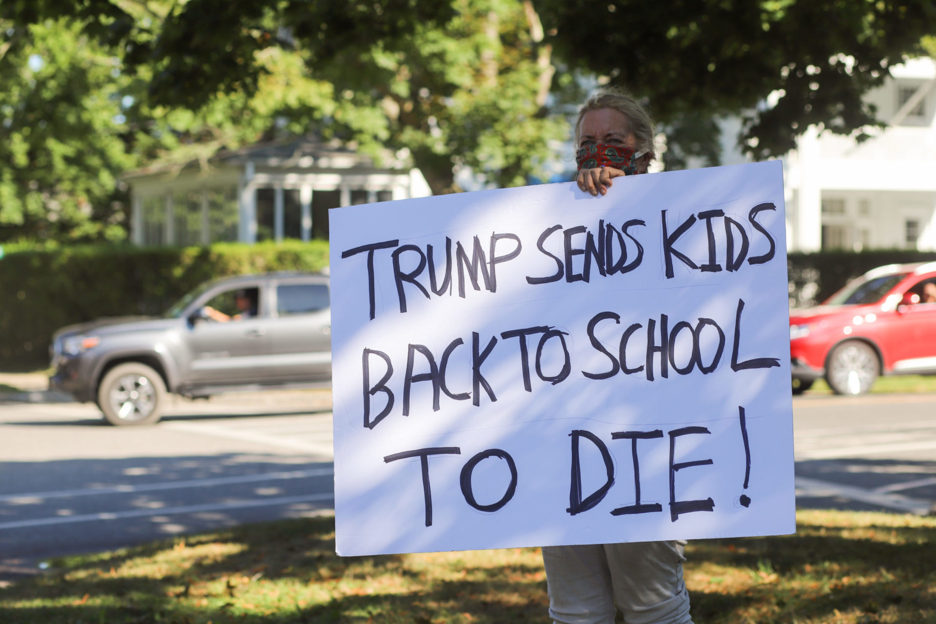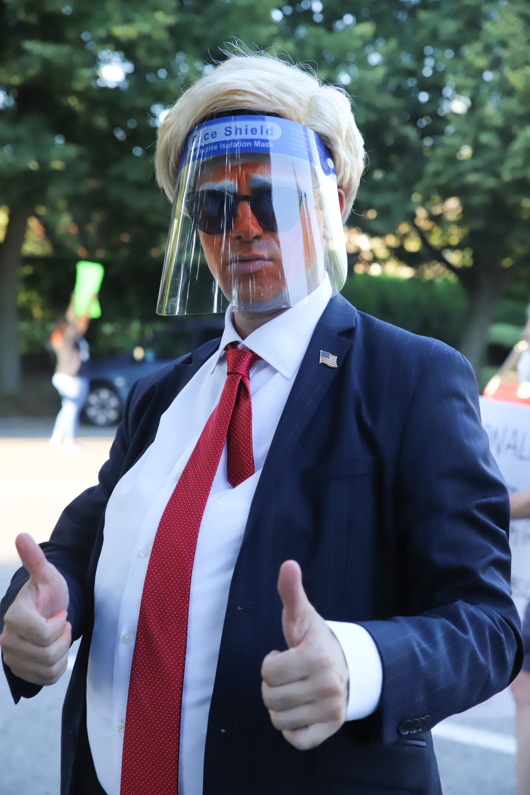When Lisa Votino, the protest organizer, found out that the president would not be arriving in Southampton until Saturday evening, due to a press conference in New Jersey on coronavirus relief, she postponed the protest by two hours. It got underway at about 5:30 p.m. Marine One landed at Southampton High School shortly after 6.