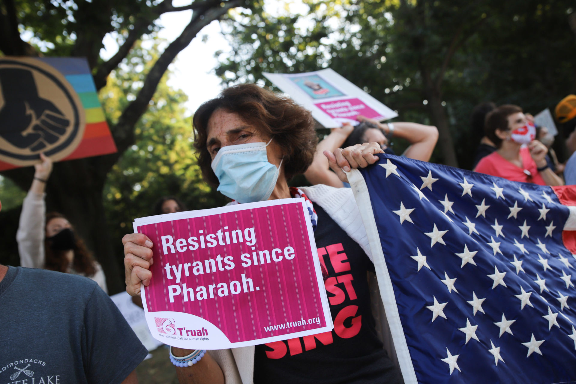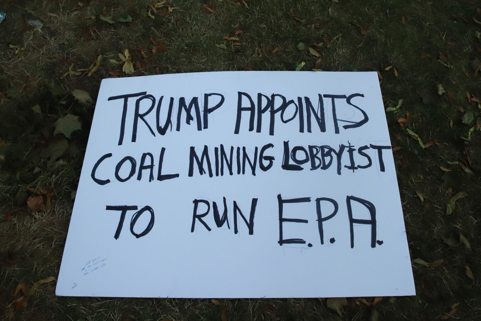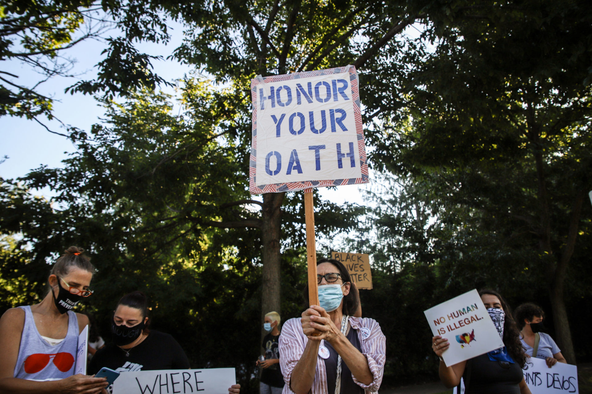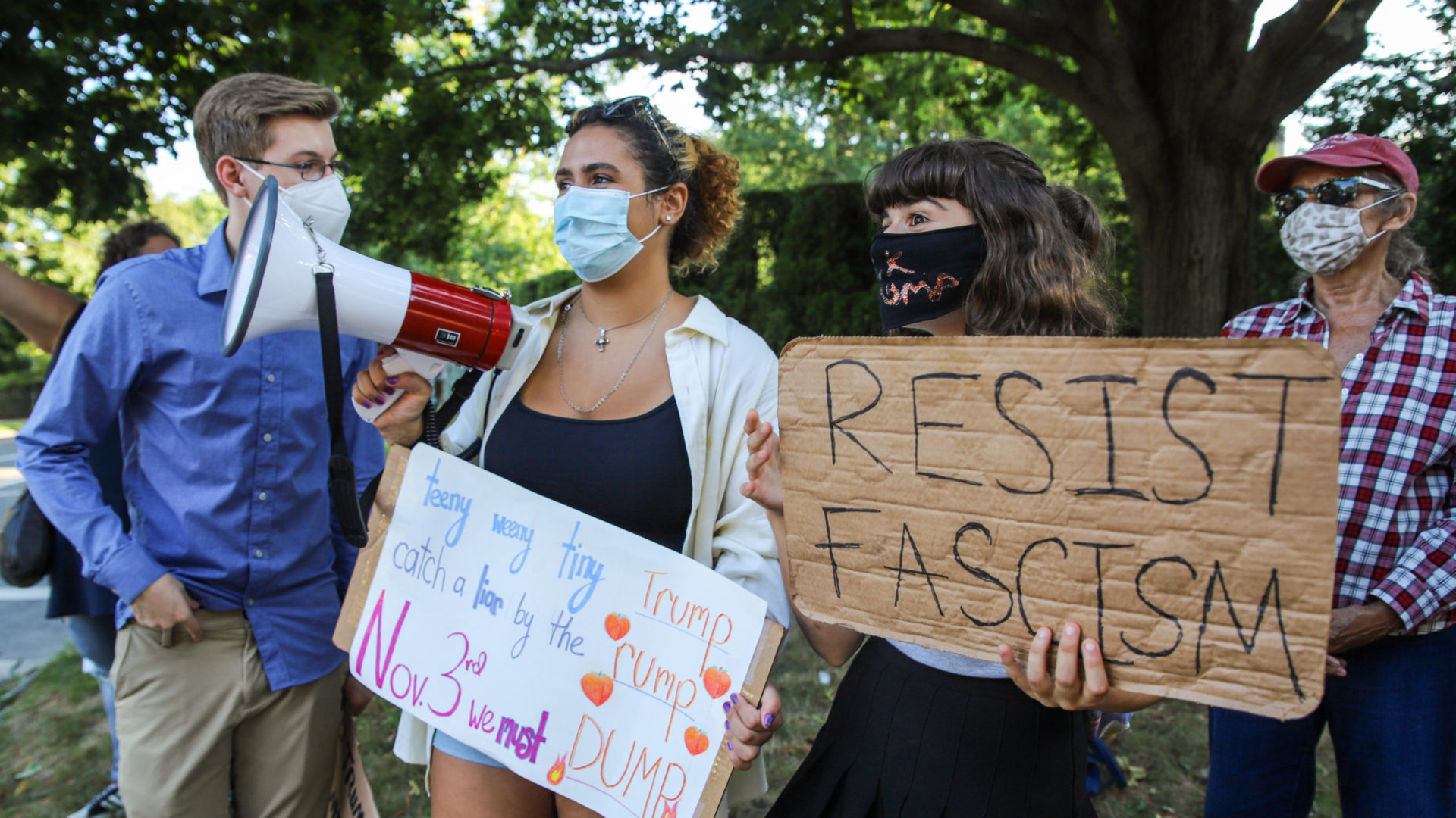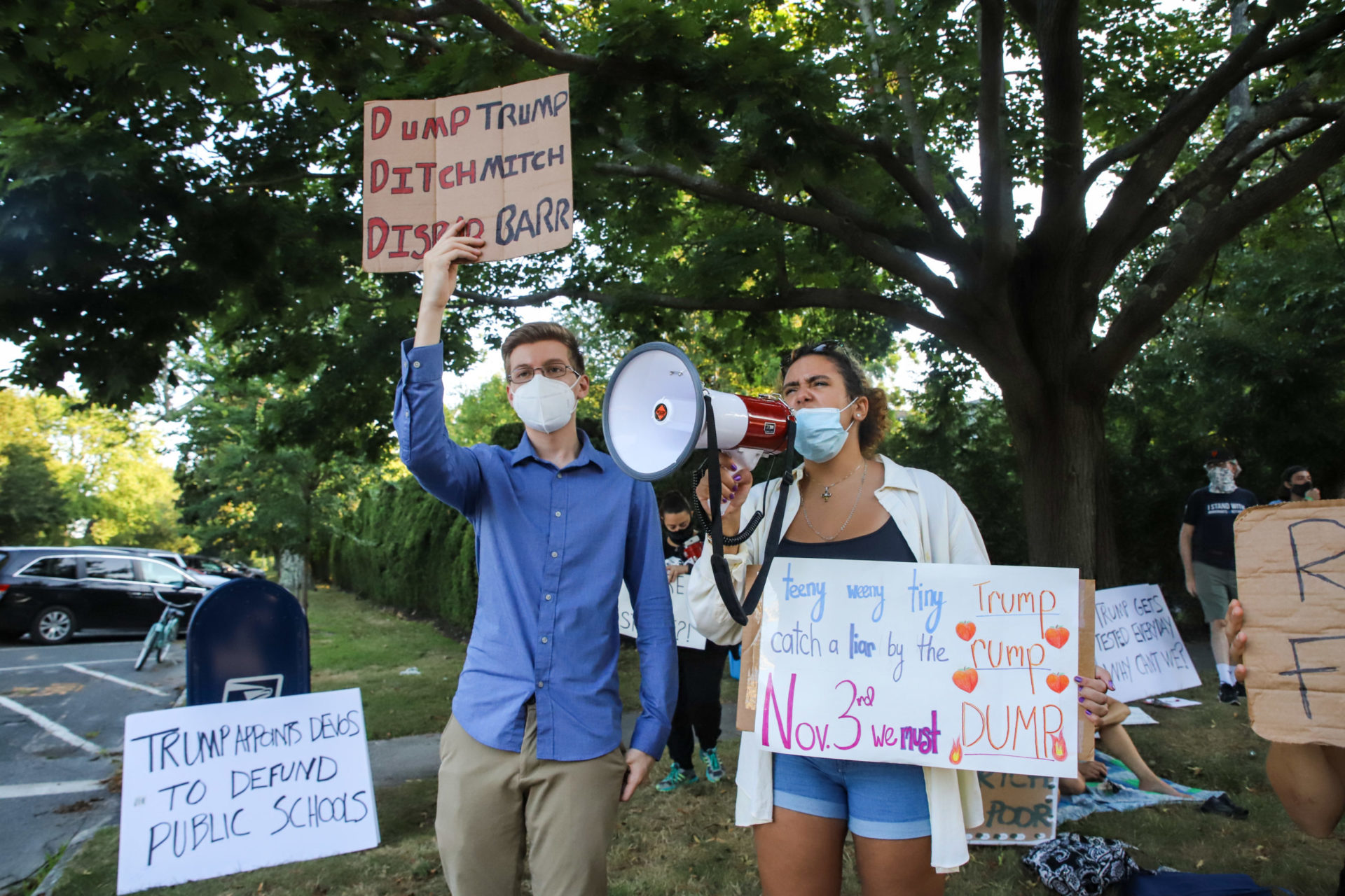 Another person held a sign that read, “Trump gets tested everyday. Why can’t we?,” referring to COVID-19 testing. Protestors wore masks when they stood in groups.